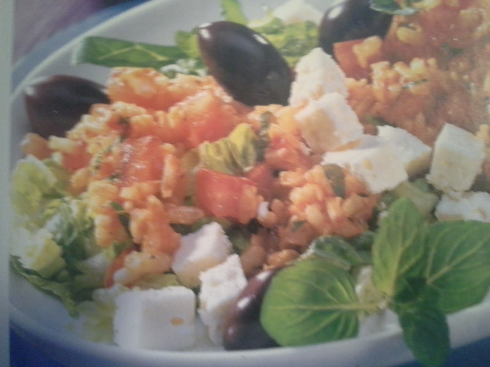 Line platters with lettuce and top with the rice and tomato mixture, the eggplant, cheese and olives. Serves 6.