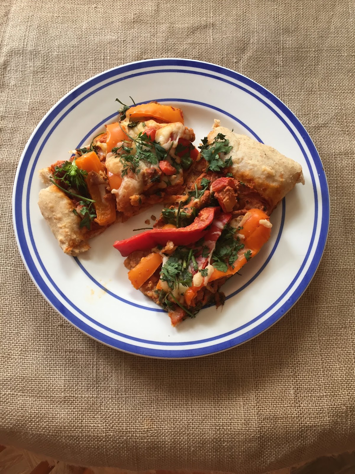 Heat the oil and butter in a large sauté pan and sauté the onion, garlic and ginger for 5 minutes. Add the spices and stir until fragrant. Stir in the tomato paste and cream and simmer for 8-10 minutes. Set aside. Oil a 12”x17” heavy baking sheet and spread the risen dough to fill the pan. Spread the sauce over the dough and top with the pepper strips and shredded cheese. Bake in a preheated 450º oven for 15 minutes. Garnish with chopped cilantro. Cut into squares and serve immediately.
