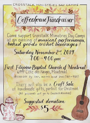 At present I’m running around setting out dishes, arranging chairs and prepping supplies for the Bible Study etc. My contribution to our supper is an Autumn Charcuterie Board but that can only be assembled at the last moment although, by mid-afternoon, I will need to start the hot apple cider since it takes quite a while to heat up in the slow-cooker. I bought 6 litres of cider and hope it will be enough for the hungry horde😊 A certain amount of time this week has been spent pulling together everything for this evening. Miriam and Donna sent me their choice of songs so I was able to get the PowerPoint completed and I then  printed out copies of the Taizé Bible study. This morning while Steven was at home to watch Thomason I dashed down to the corner store to get a sheet of white Bristol Board as the small groups will be drawing on mini-Prayer Boards during their devotions time.  All in all things seem to be coming together quite well and I’m expecting about 15 young adults, mostly recent Team Members as well as a few of the Committee members. Jillian is coming as she is the coordinator of next month’s Coffeehouse and so wants to hype it to the gang. I’m very pleased with the poster she designed and Henry did a great job printing it for us. We will be asking everyone to take copies to hang at their churches or schools.