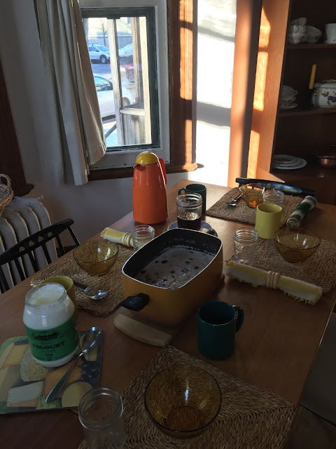 During the week Steven asked if some friends of his might be able to stay with us this weekend. These 3 young men drove up from New York yesterday to meet up with John, the brother of 2 of them, who is in Montreal on a concert tour with the National Youth Orchestra. The 3 brothers are old family friends of Steven’s family from the years they lived in Winnipeg. They are all musicians, as is the other friend, Anthony. Thursday evening Steven went to the concert, which took place at Notre Dame Basilica in Old Montreal, then the gang from New York arrived late yesterday afternoon so their were six of us for dinner last evening!!!In the morning I had headed up to the bank on CTM business and then stopped at the grocer to load up with ingredients for the meal 😊.I decided to make borscht because I have all the root vegetables on hand from my winter veggie box. Along with the borscht I made a batch of cornbread and for dessert baked an apple pandowdy. In the end last night they all decided to bunk into John’s downtown hotel room as they had been out on the town rather late. This caused a weensy problem here at home since I had already prepared Overnight Oats in my slow cooker, set the breakfast table, and of course made up extra beds. I’ve never tried freezing overnight oatmeal but that’s what I’ve done with all the extras. Steven manfully ate 3 helpings this morning and I had 2 but even so there are a lot of leftovers.It is a delicious recipe and great in the winter, so let’s finish this post with it.