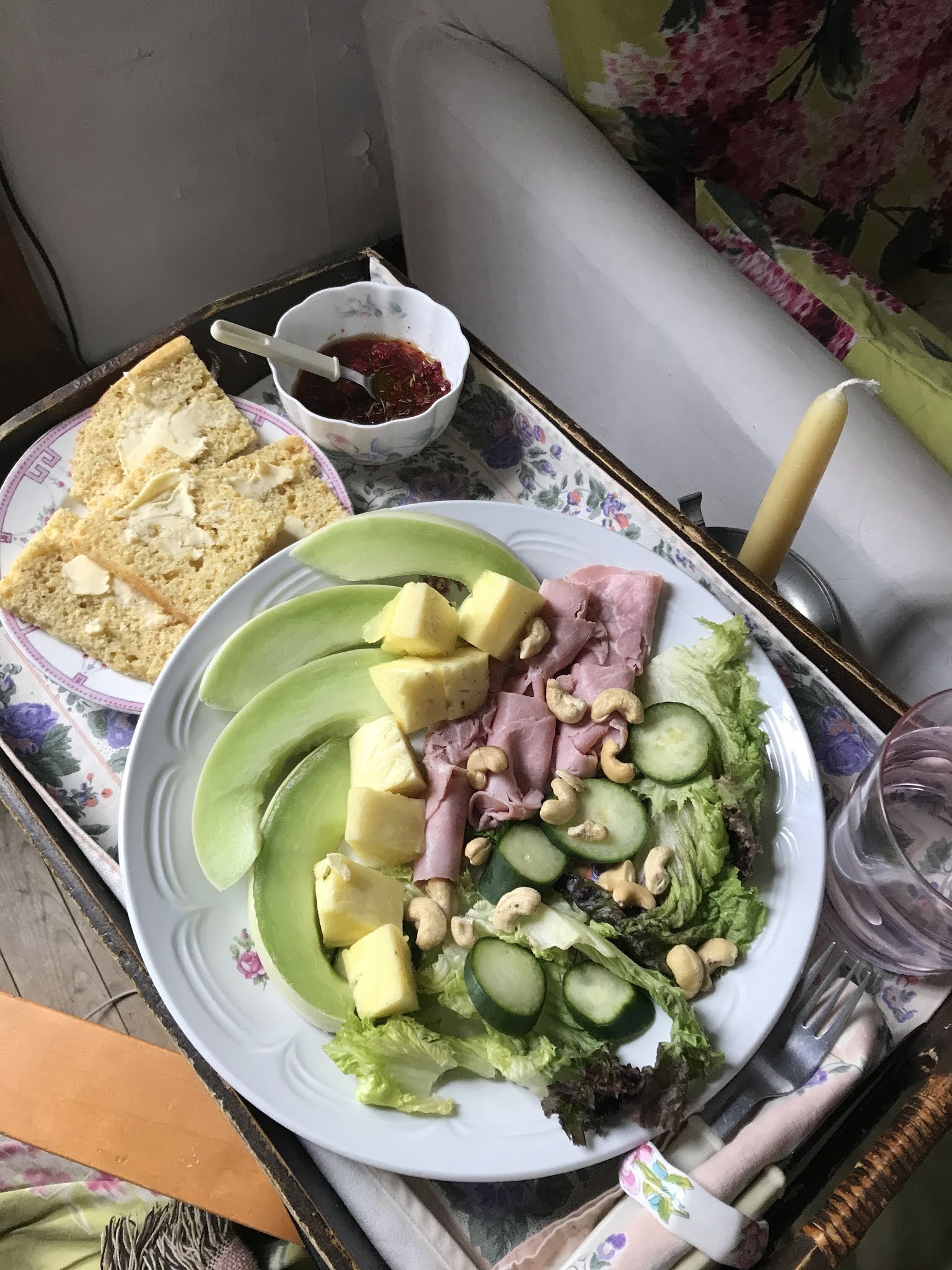 Wash and shred the lettuce and divide between 4 large dinner plates. Arrange the ham, melon, cucumber and pineapple over the bed of lettuce. Garnish with cashews.