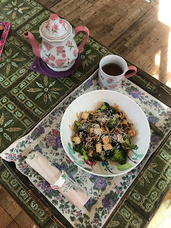 Cook the noodles, drain and set aside. Heat 1 Tbsp. oil and stir-fry the tofu, onion and garlic until browned, remove to a small bowl. Heat the remaining oil and briefly stir-fry the broccoli and mushrooms. Combine the Tamari, vinegar, Sriracha and maple syrup and add the sauce to the pan along with the reserved tofu mixture and the cooked noodles, reduce the heat to very low and fold everything gently together until heated through. Divide between individual bowls and top each with toasted sesame seeds. Serves 3-4.