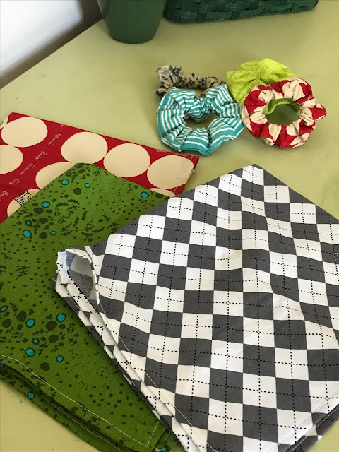 We also have had a couple of rainy afternoons on which I sewed 2 summer outfits- a pair of lightweight overalls and a sundress, some summer bandanas for Thomason and a few scrunchies for myself. Soon I shall really have to return the sewing machine that Sue lent to me several months ago after mine broke down so I’m hurrying to do any “summerish” sewing because I don’t know how long it will be before I can purchase a new machine.
