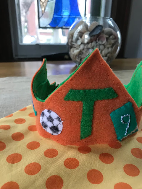 This week I also worked on the birthday crown for my Godson Tighe. He will be NINE later this month and has chosen an orange and green crown with appliqués of a soccer ball, a book, pizza and fruit juice and waves (he loves swimming!) I am pleased with the result and hope he will be too.