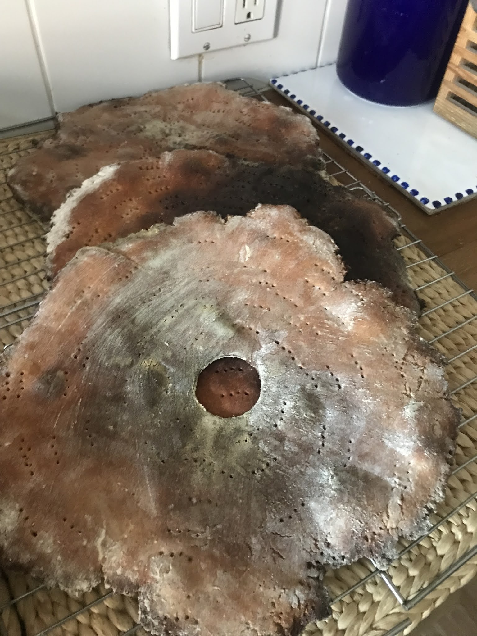 Divide into 3-4 balls and roll each into a thin 12” circle. Using a 2” cutter cut a circle out of the center of each piece. Transfer to parchment lined baking sheets (or pizza pans) and prick each piece all over in a decorative pattern. Let rise for 45minutes. Bake in a preheated 425º oven for approx. 15 minutes or until crisp. Transfer to cooling racks and immediately brush each crispbread with warm water. Store in an airtight container to keep it crisp. Delicious with cheese or cold cuts and pickles 🙂