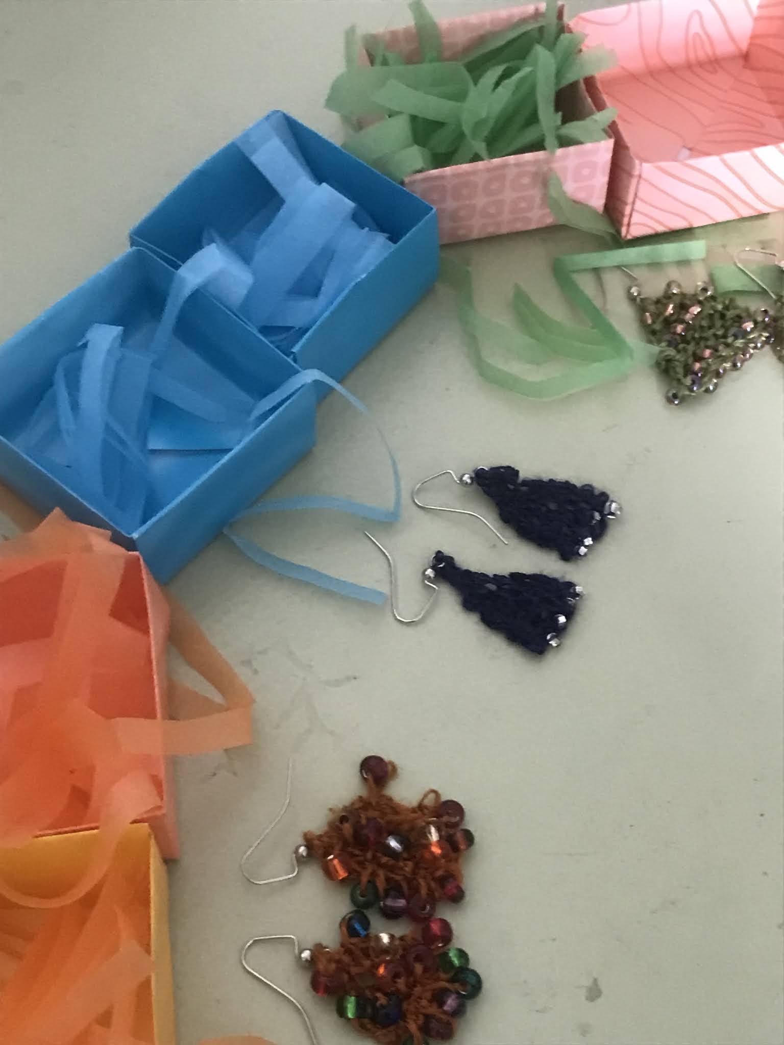 Evenings I have been knitting silk and bead earrings as a birthday gift for a special friend. They are now completed and I’ve folded origami boxes for each pair and hemmed a furoshiki to wrap the gift. Now I’m back to knitting another stripy scarf before returning to some Newfoundland Gloves that are the next project on my list.