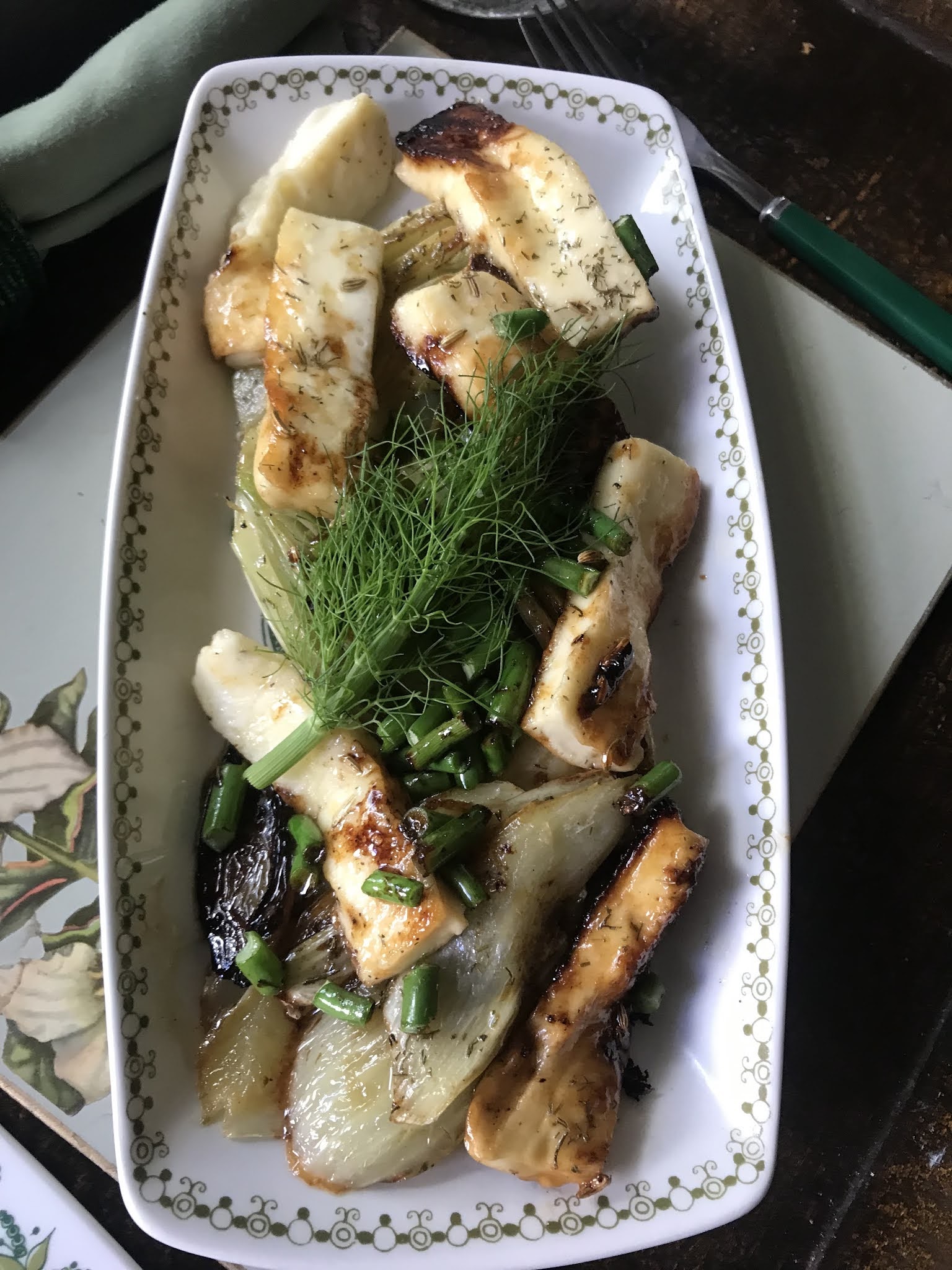 Take off the fennel fronds and root ends then slice each bulb lengthwise into ½’ thick slices. Melt half the butter and oil over high heat, then add a layer of slices, frying on each side for about 2 minutes or until golden, remove from the pan and keep frying the rest of the slices adding more oil and butter as necessary. Add the fennel seeds, sugar, salt and pepper to the pan then return all the slices, caramelising them briefly, just to coat them with the melted sugar mixture. Allow them to cool on a plate then toss them in a bowl with the garlic and dill. Meanwhile fry the haloumi in the remaining mixture for 1-2 minutes each side Arrange the fennel and haloumi on a platter and garnish with some of the fronds. Sprinkle lightly with lemon juice.