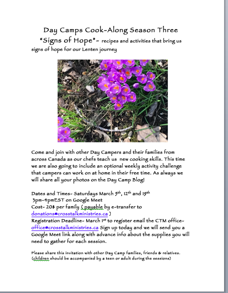 Sadly this week Junior Youth Camp had to cancel their Winter Camp Day that was planned for the last Saturday in February. There are still too many restrictions around indoor gatherings in churches to make it possible and although they did plan to spend the afternoon portion skating and sledding, it is too cold to spend the whole day outside and lunch would have been impossible. I suggested that perhaps some of the campers might like to join the Day Camp Cook-Along sessions and sent a copy of our flyer to the JYC Directors in case they would like to circulate it, we’ll see if they decide to.