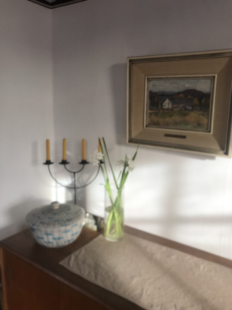 Meanwhile, behind the scenes, the house décor has morphed from Advent/Christmas to Epiphany/Winter. The task took several evenings to complete as there is a lot of “Advent and Christmas”!! I had such a beautiful Christmas tree given to me this year that I really hated to take it down, as it was still very fresh and green. It was exceptionally large and I was quite worried about getting it out of the stand and out of the front door but, thankfully, Deacon Alex came to my rescue and, between the two of us, in the pouring rain, we managed to wrangled it outside and leave it on the lawn by the curb side for the city to collect. They turn the trees into mulch that is used on the flowerbeds in all the municipal parks, which is a super way to compost them!