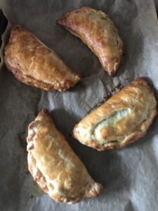 Place all the filling ingredients, except the egg in a saucepan, and simmer for 30minutes. Allow to cool, then proceed by rolling out the pastry and cutting into circles, about 20cms in diameter. Pile a mound of filling on each circle, dampen ½ the rim with a little cold water, then fold the other half over former a turnover, crimp the edges decoratively, then place on a parchment-lined baking sheet and brush with beaten egg. Bake in a 400ºF oven until golden, about 15-20 minutes. Serve hot or at room temperature, makes 6-8 turnovers.