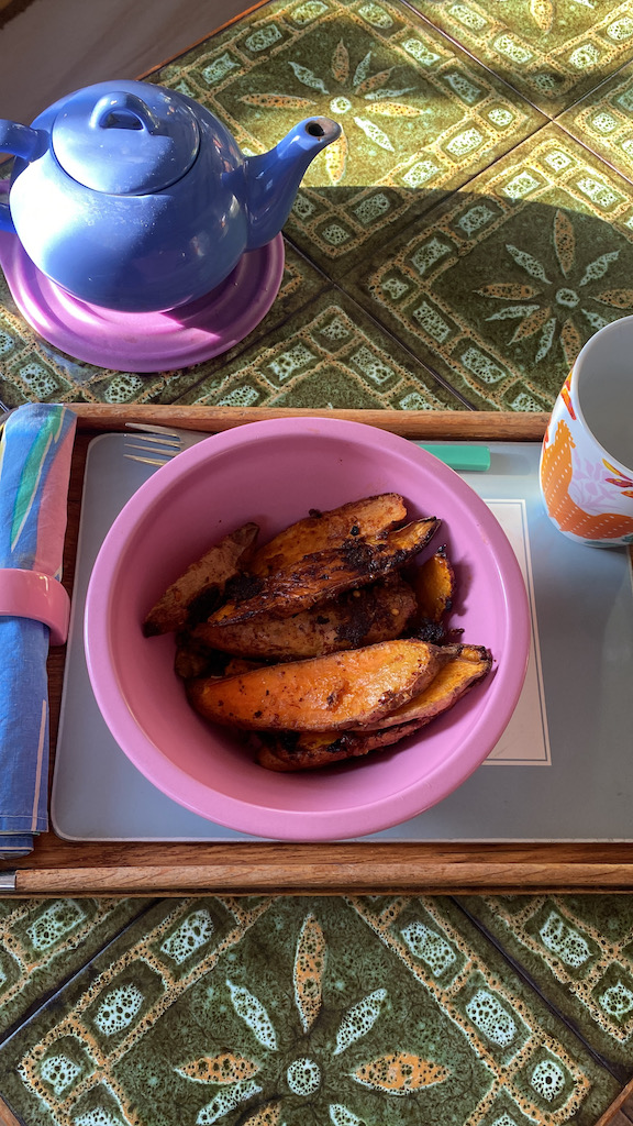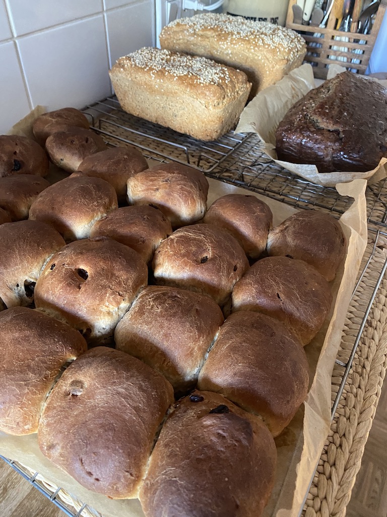 Due to today’s Retreat, I decided to have my Bake yesterday afternoon and so made a third batch of Hot Cross Buns (no I have NOT eaten all of them, there have been quite a few Lenten visitors), the regular GF Loaves, a Cardamon. Banana Loaf (new NYT Food App recipe) and a Breakfast custard, which I will have for my breakfast on a few mornings during the coming (Holy) Week.